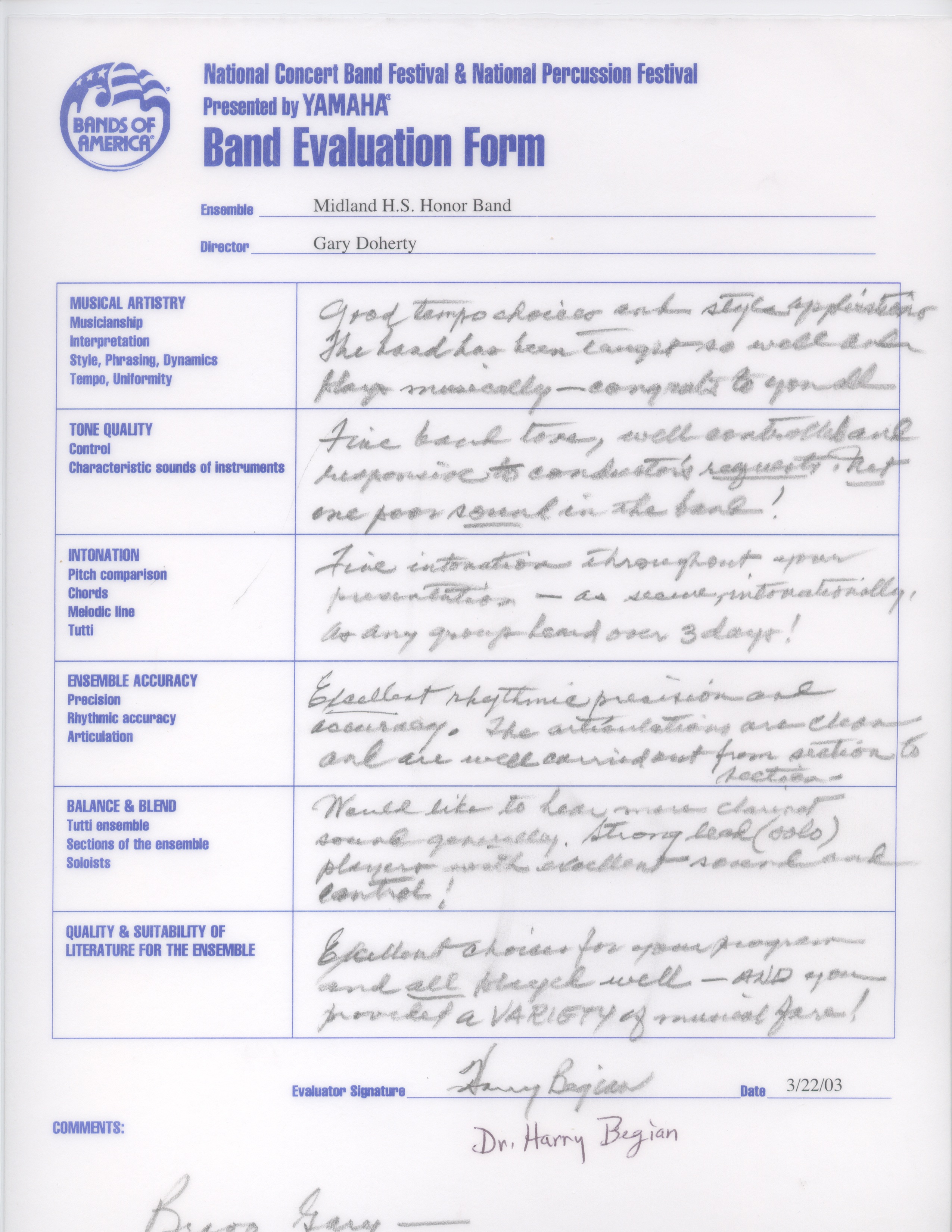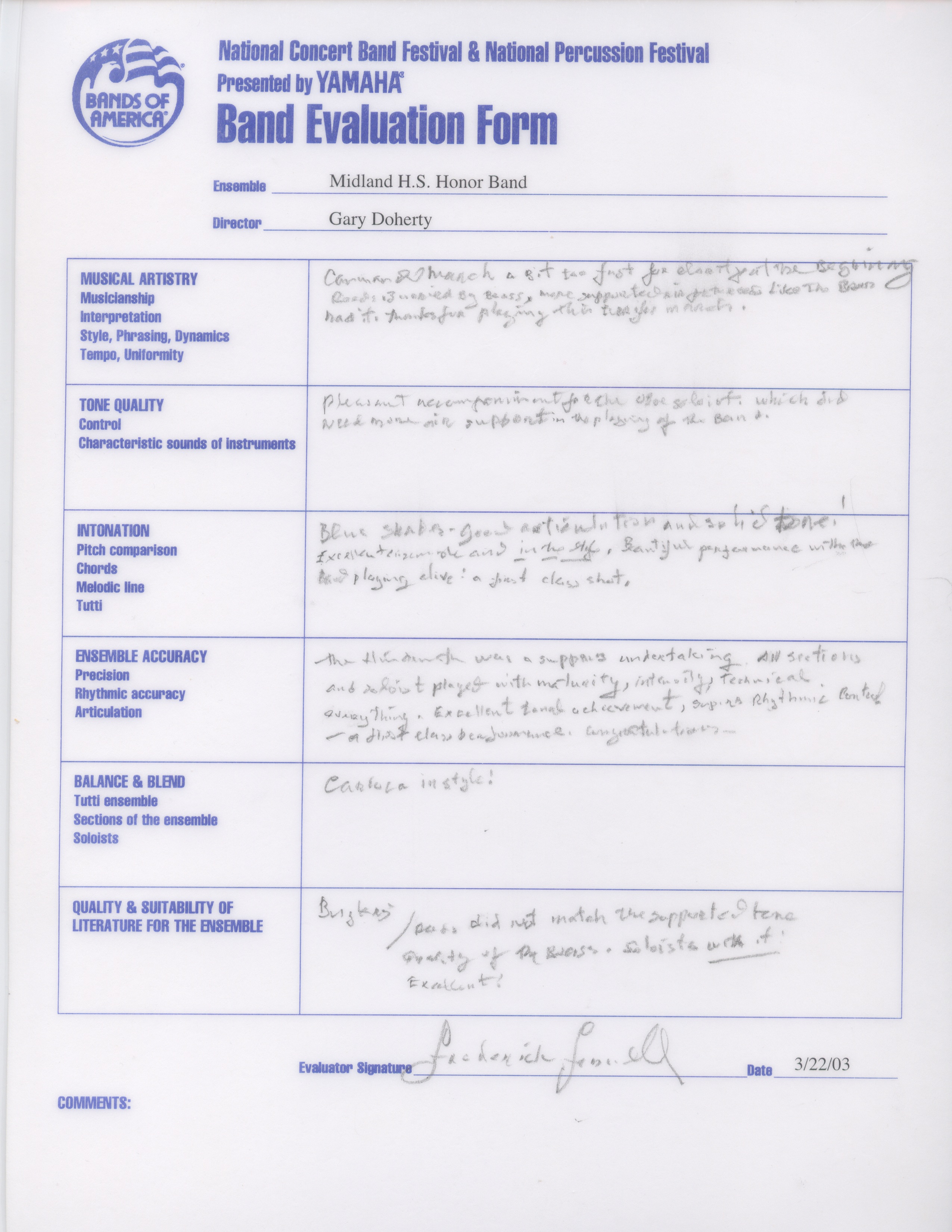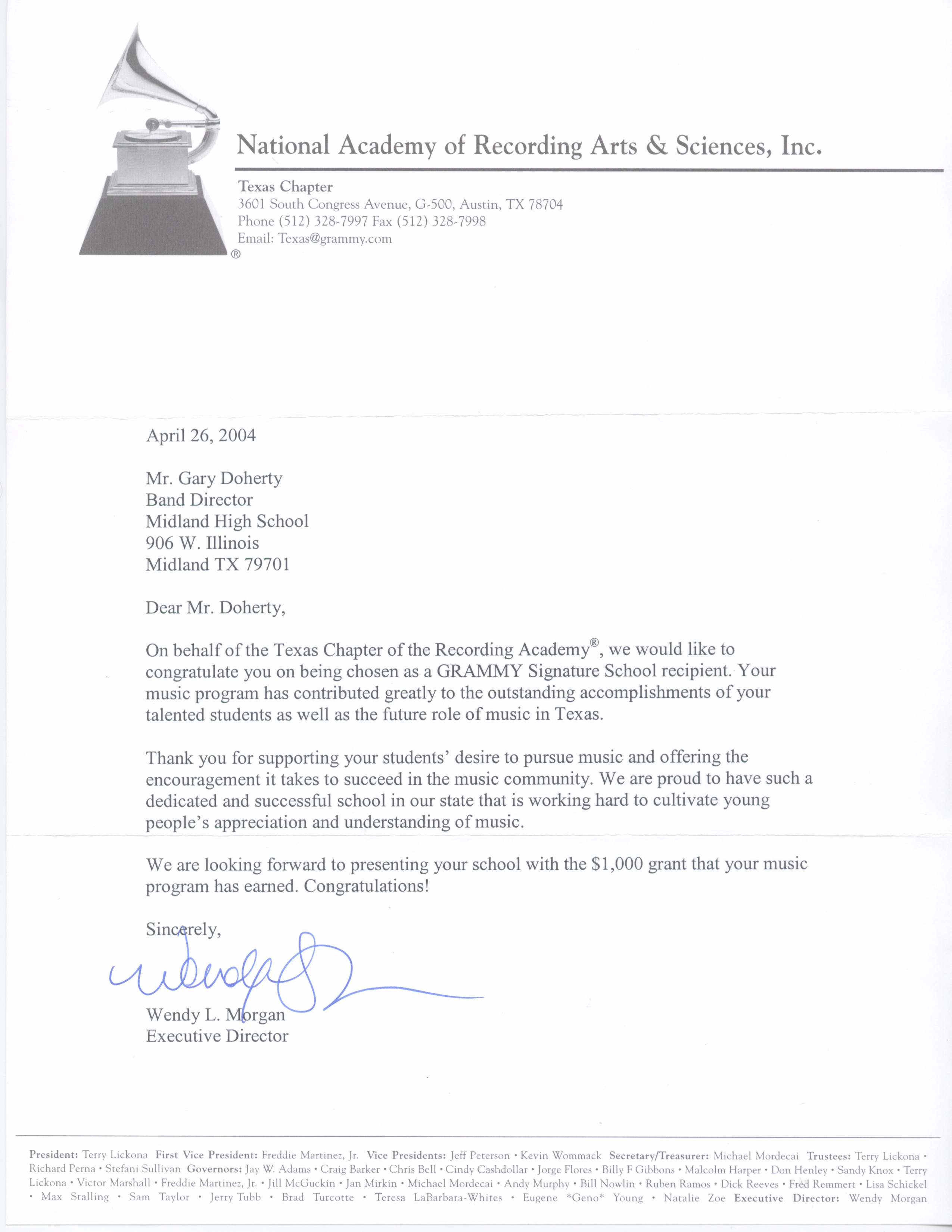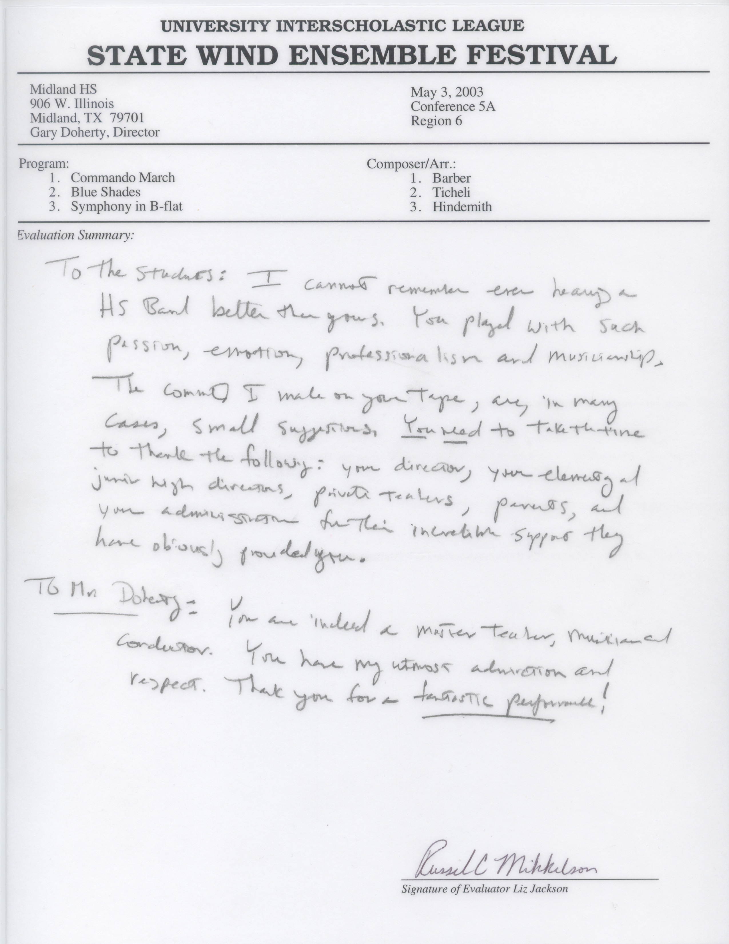Administrative and Artistic oversight for more than 1000 students, 12 full-time teachers, 27 private instructors and more than 50 adjunct staff in the Midland High School Cluster of Schools. Attained International recognition for the artistic merit of these outstanding ensembles. State Honor Band Finalist 5 times, State Wind Ensemble Finalist 10 times, Area and State Marching Band Finalist 8 times. National Concert Band Festival Featured performer in 2003, President George W. Bush’s Invited High School Band for the Inaugural Parade in 2001, American Representative High School Band, London Millennium Parade, January 1, 2000.